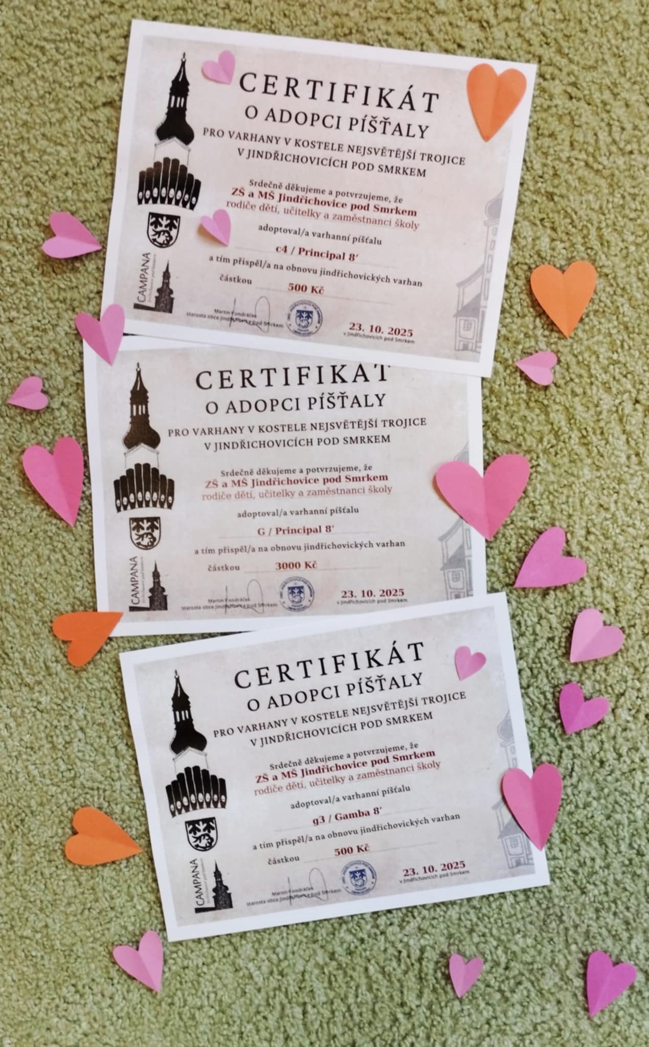 23. října 2025 – Díky škole se na účtu adopce varhan podařilo přehoupnout přes částku 100.000,- Kč. „S píšťalkou od dětí, 100 tisíc poletí!“ Moc si takového symbolického kroku vážíme! Díky rodičům dětí, učitelkám a zaměstnancům školy má místní ZŠ a MŠ Jindřichovice pod Smrkem tři adoptované školní píšťalky, celkem v hodnotě 4000 Kč. Ke dnešnímu dni je na účtu částka 106.100 Kč.