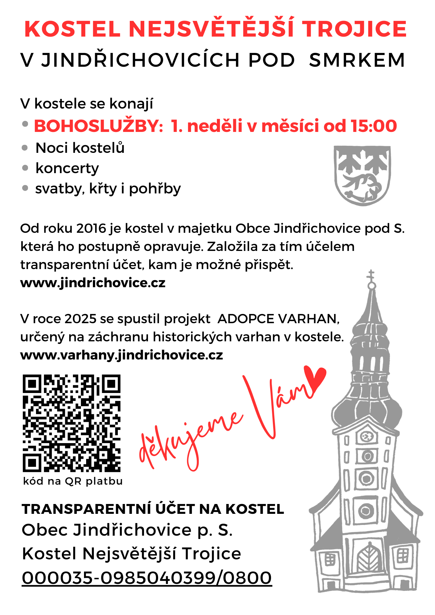 Darovat můžete jakoukoliv částku na transparentní účet Obec Jindřichovice pod Smrkem – Adopce varhan Jindřichovice pod Smrkem,